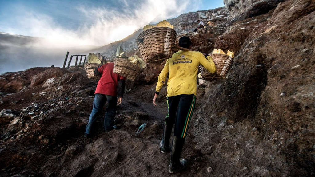 Ancak bu tehlikeye rağmen o bölgede yaşayan sülfür madencileri her gün risk alarak krater etrafında bulunan kükürtü toplayarak dik yamaçlarda taşımaktadırlar. Eridiğinde koyu kırmızı olan kükürt birikir ve soğumaya başlar. Bu esnada rengi sarıya döner. Madenciler ise soğuyan bu kükürt katmanını parçalayarak sepetlere doldururlar ve yola çıkarlar. Hadi gittikleri güzergahın uzunluğunu ve tehlikesini es geçelim, taşıdıkları sepetlerin ortalama ağırlığı 80kg. Yanlış duymadınız. Üstelik bunu günde 4 defa falan yapıyorlar ve karşılığı ise çok az bir ücret.